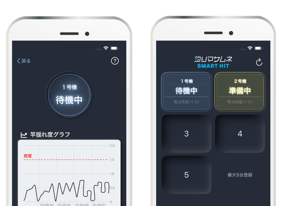 専用アプリでは5本までの竿に名称を付けて、登録することが可能。どの竿がどんな状態なのかを、専用アプリの1画面で簡単に把握できます。