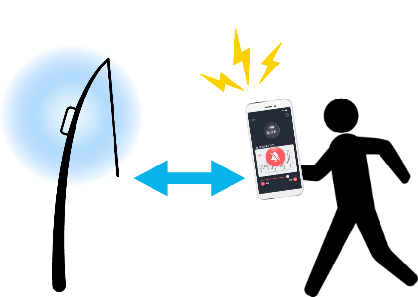 SMART HITとアプリはBluetooth® 通信で接続。IoTデバイスメーカーの技術力を活かした最大100m※の通信を実現しました。離れていても瞬時にアタリを検知しスマホに通知するから、安心して竿から離れられます。